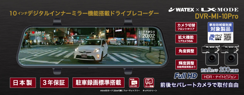 デジタルインナーミラー機能搭載 ドライブレコーダー DVR-MI-10Pro